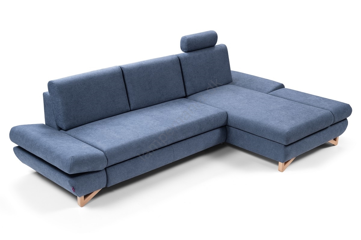 • Højrevendt L-formet polstret hjørnesofa AVESTA med sovefunktion og opbevaringsrum, blå