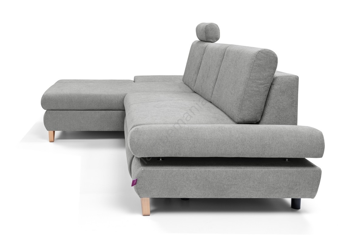 • Udtrækbar polstret L-formet hjørnesofa med opbevaringsplads AVESTA venstrevendt grå