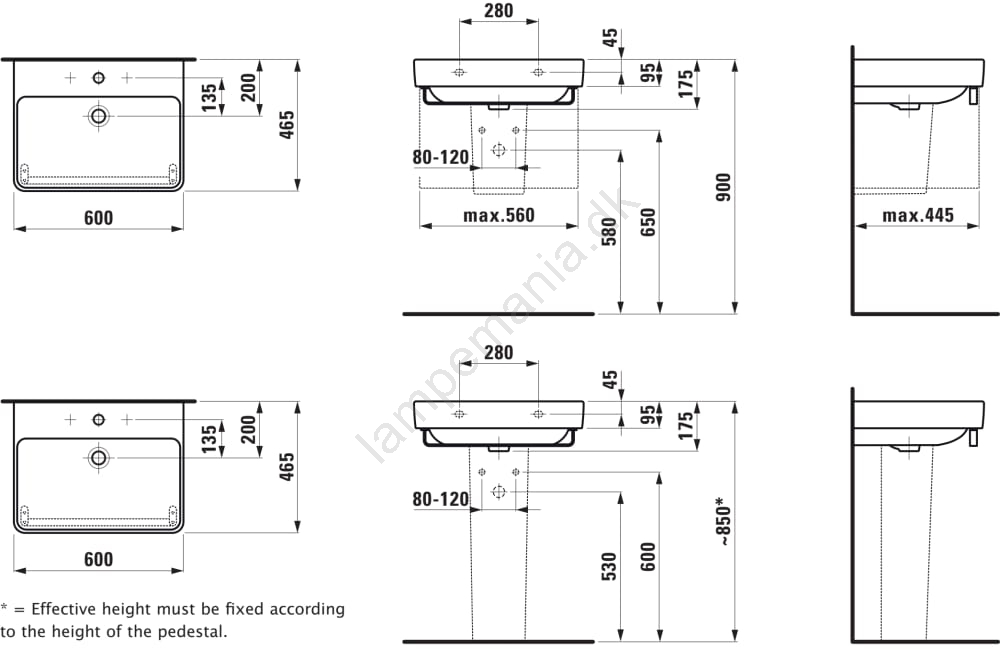 • Håndvasken kan monteres på bordplade eller som væghængt model.