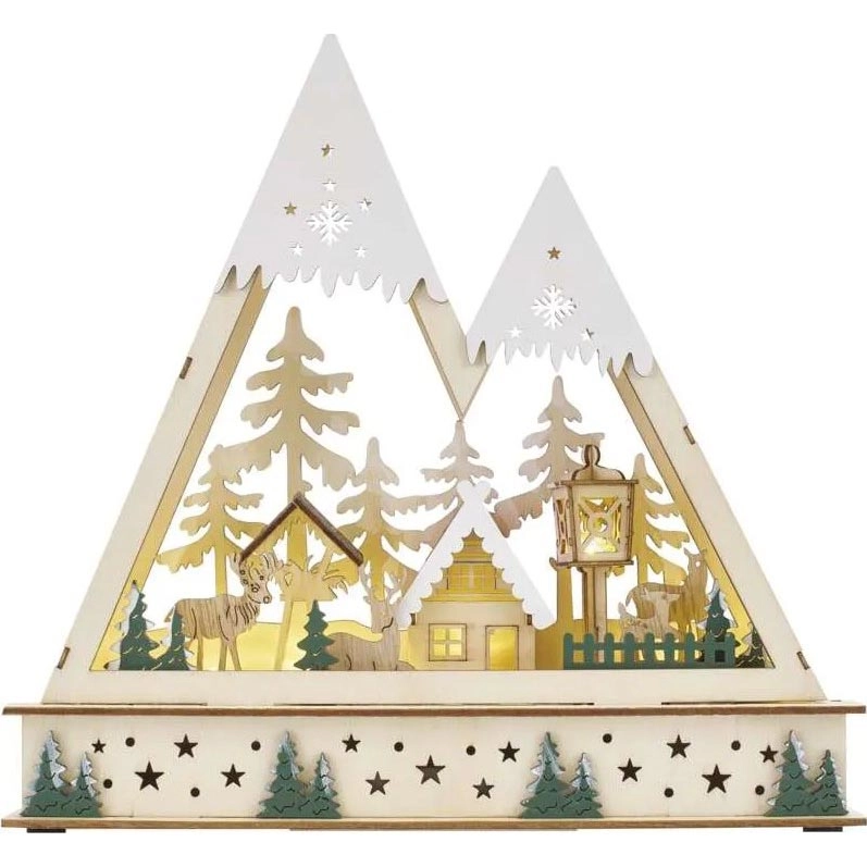 • Udskåret dekoration med motiv af snedækkede bjerge og skovdetaljer — den perfekte tilføjelse til din festlige adventsdekoration.