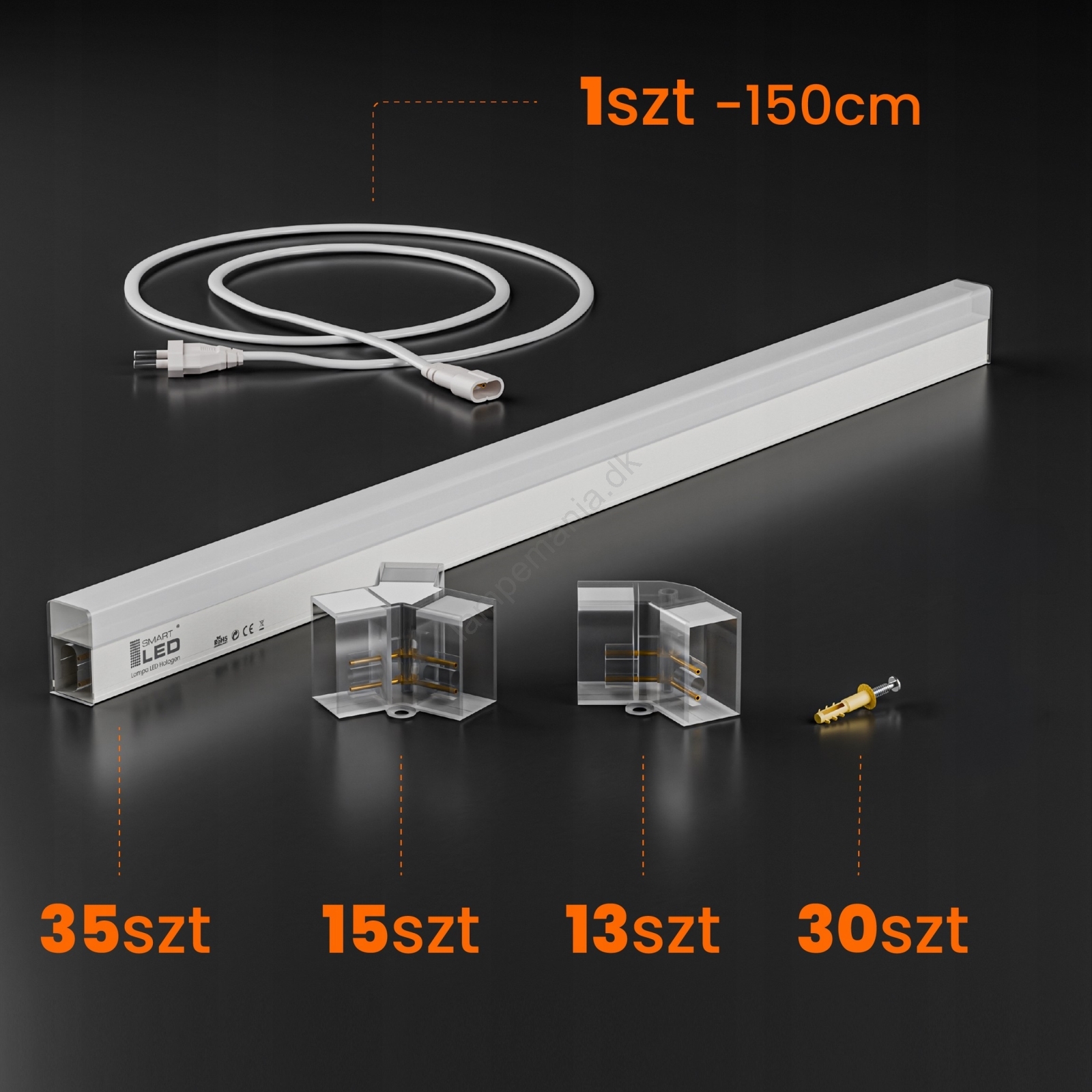 • Pakkens indhold: strømkabel (150 cm), 35 LED-paneler, 15 3-polet stik, 13 vinkelkoblinger, 30 rawlplugs + skruer, monteringsudstyr (plastøjer eller metalbeslag efter eget valg).