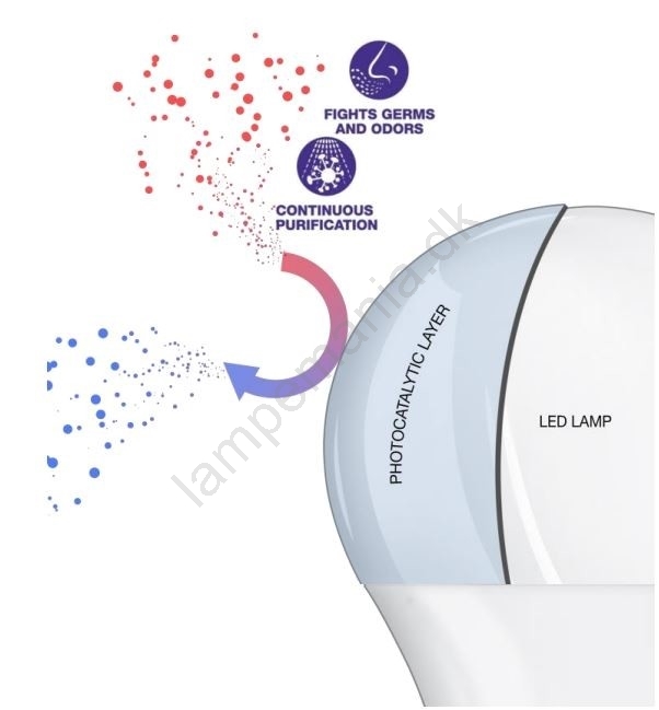 • Synligt lys genereret af pæren aktiverer nano-belægningen.