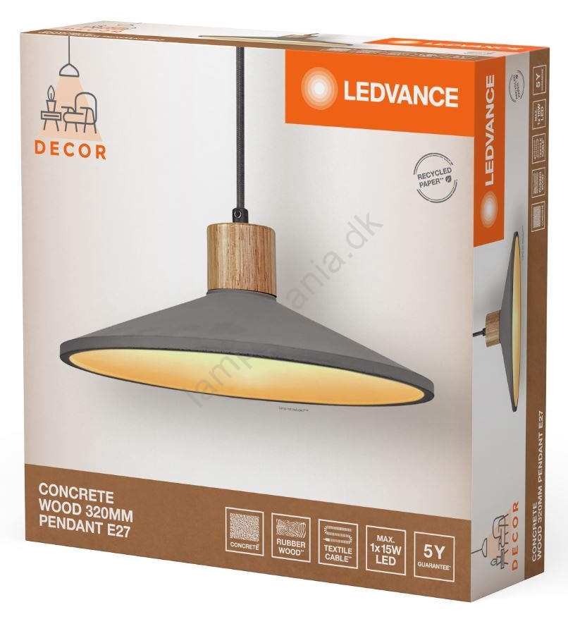 Ledvance - Pendel DECOR CONCRETE 1xE27/15W/230V diameter 32 cm beton grå er kendetegnet ved et flot og funktionelt design.  En lyspære med E27-fatning passer til denne lampe. Her kan du købe andre pærer til fordelagtige priser. Du får en interessant tilføjelse til dit hjem.