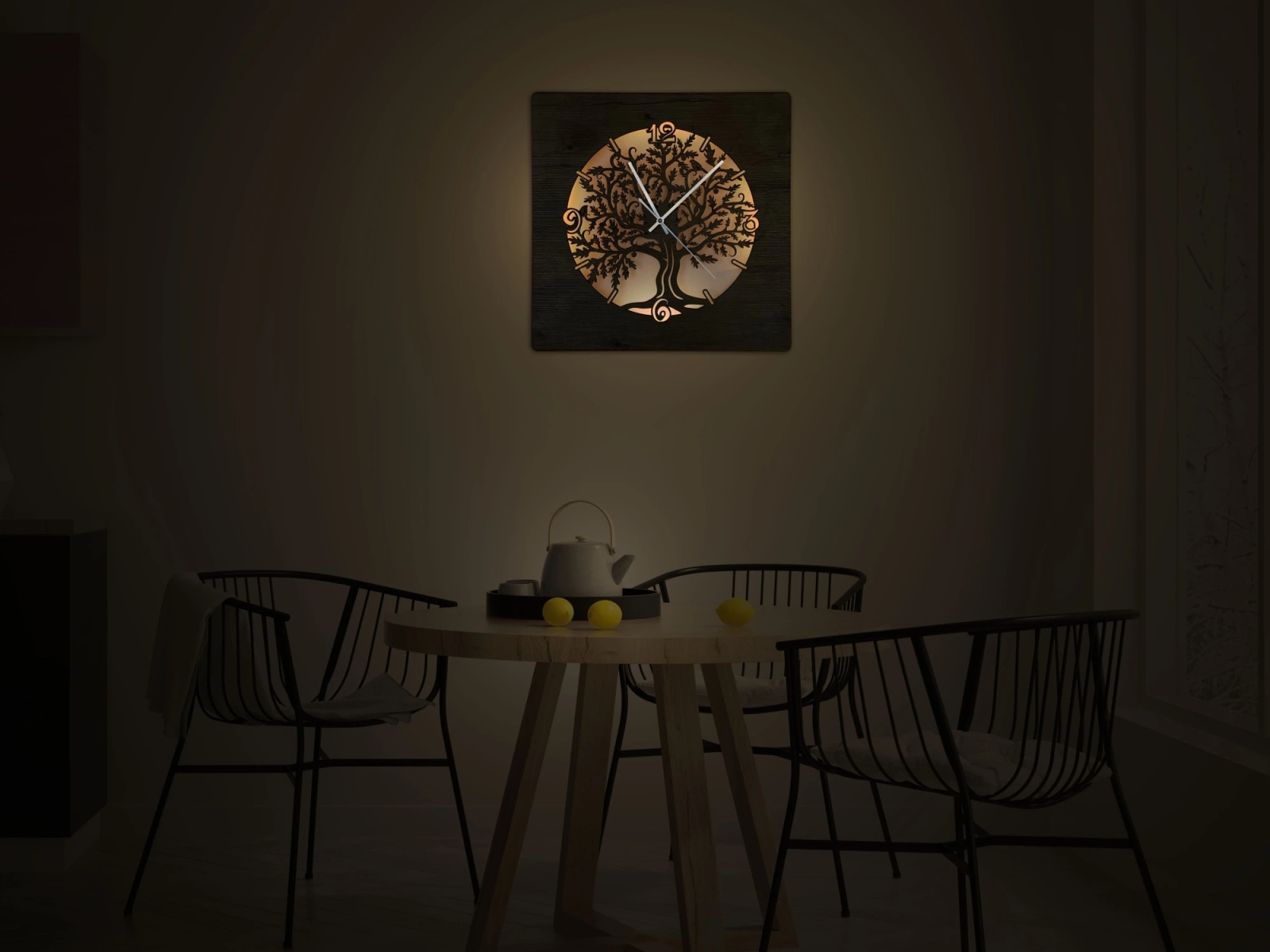 • Uret har en baggrundsbelyst urskive og afgiver et behageligt, varmt lys.