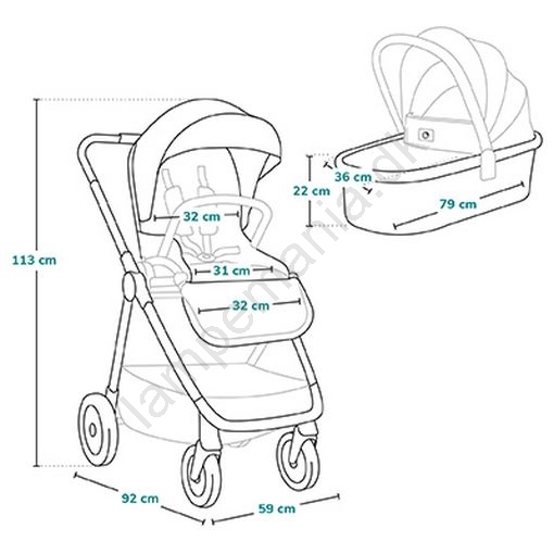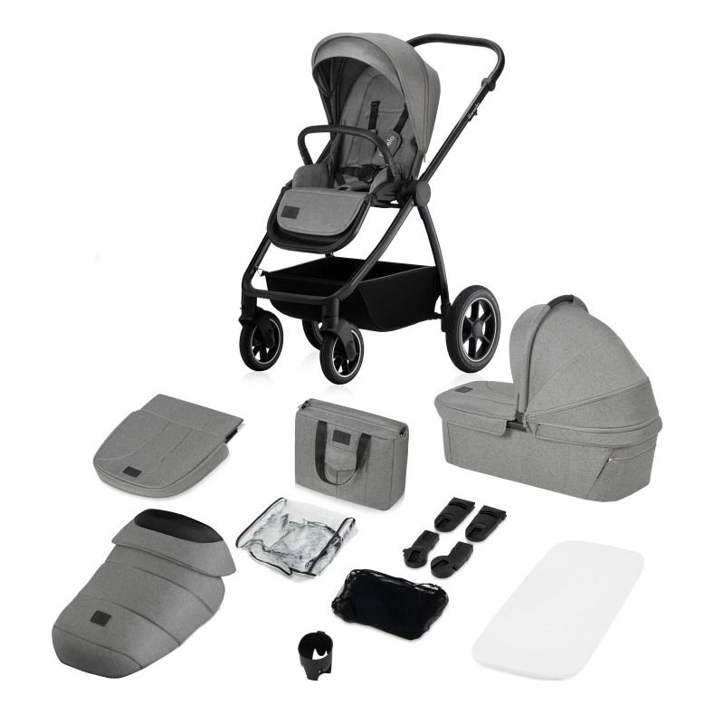 • Tilbehørssæt: fodpose, myggenet, betræk til liggedelen, regnslag, forældretaske, kopholder, låsbart opbevaringskurv.