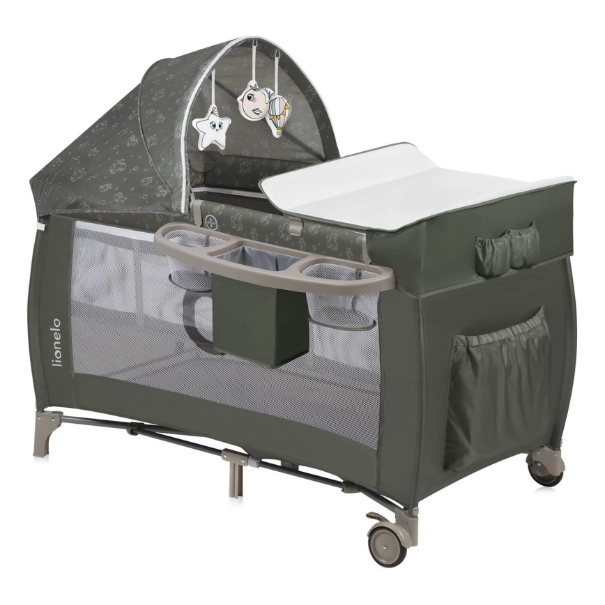 • Med i pakken: puslebord med sidelommer (til bleer, babypulver osv.), opbevaringskurv med to rum, stor myggenet, baldakin og en bøjle med plysdyr.
