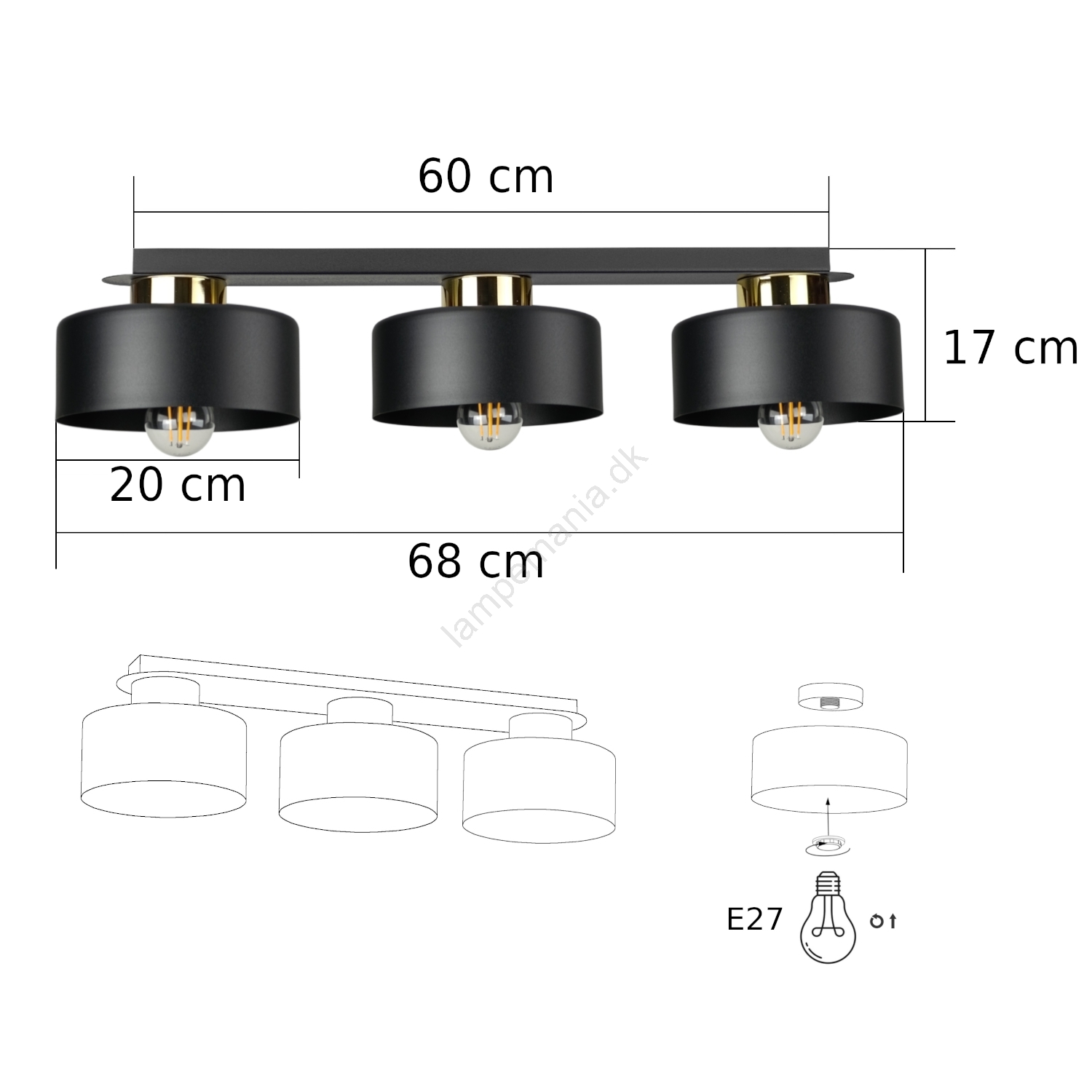 Loftlampe IGNIA 3xE27/60W/230V sort/guld er kendetegnet ved et flot og funktionelt design.  En lyspære med E27-fatning passer til denne lampe. Her kan du købe andre pærer til fordelagtige priser. Du får en interessant tilføjelse til dit hjem.