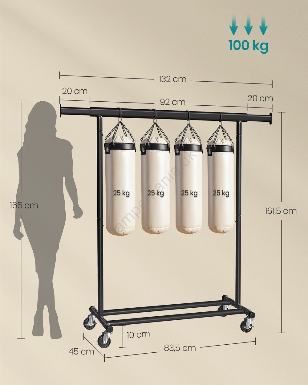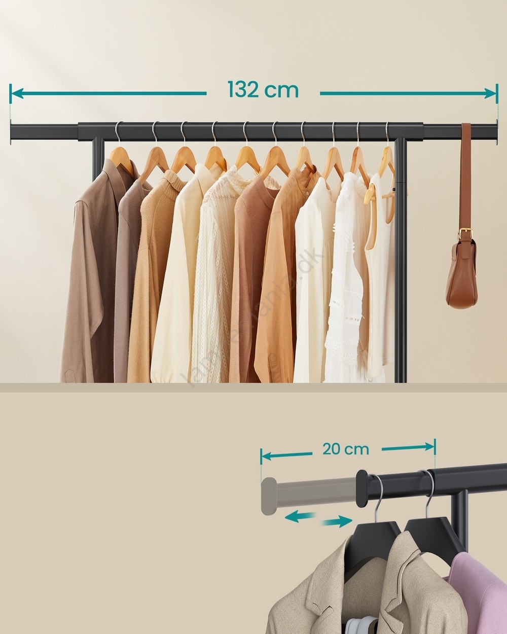• Den øverste stang kan bære op til 100 kg (ved jævn fordeling) uden at vakle eller vælte; den udtrækkelige stang giver ekstra plads til tøj, hatte, tasker m.v.