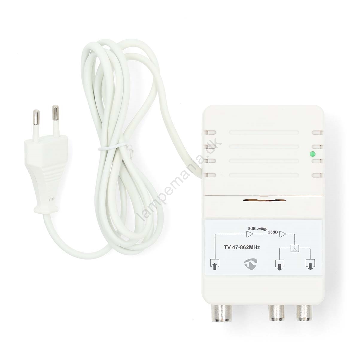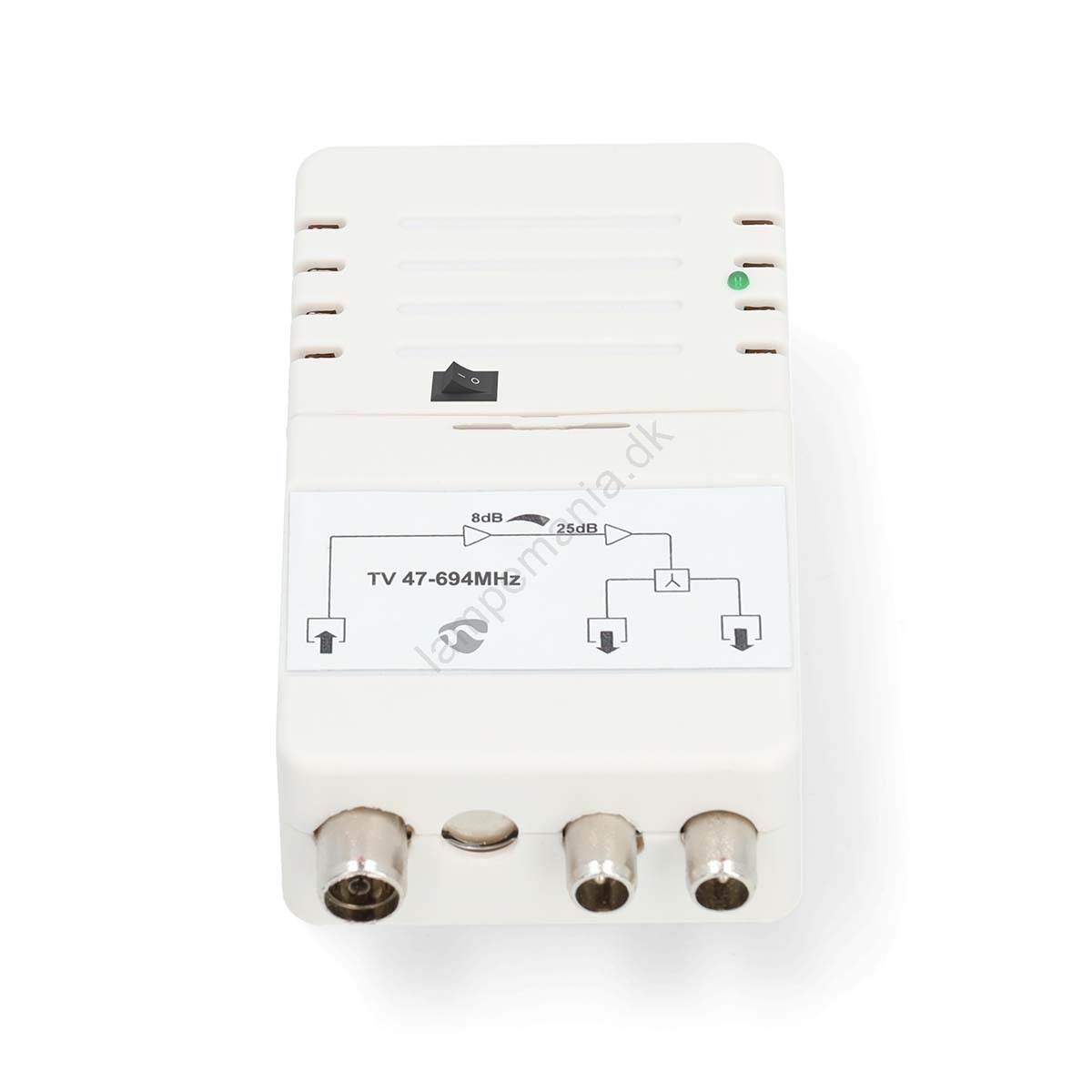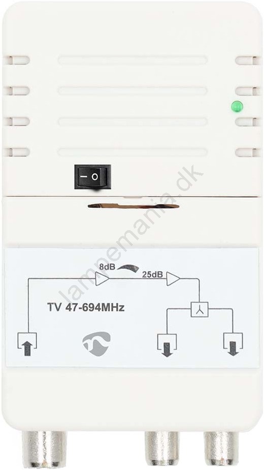 • 2-bånds indendørs antenneforstærker (25 dB) til tilslutning af to modtagere (TV/Radio).