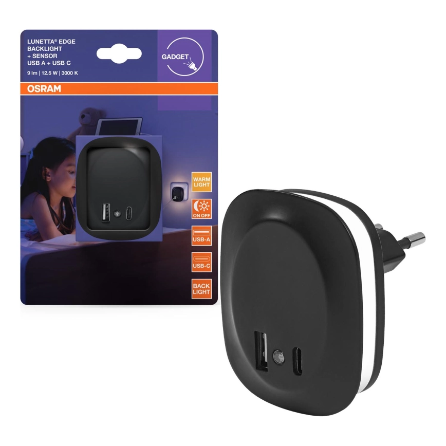 • Ledvance - LED natlampe med sensor til stikkontakt og USB LUNETTA LED/12,5W/230V 3000K sort