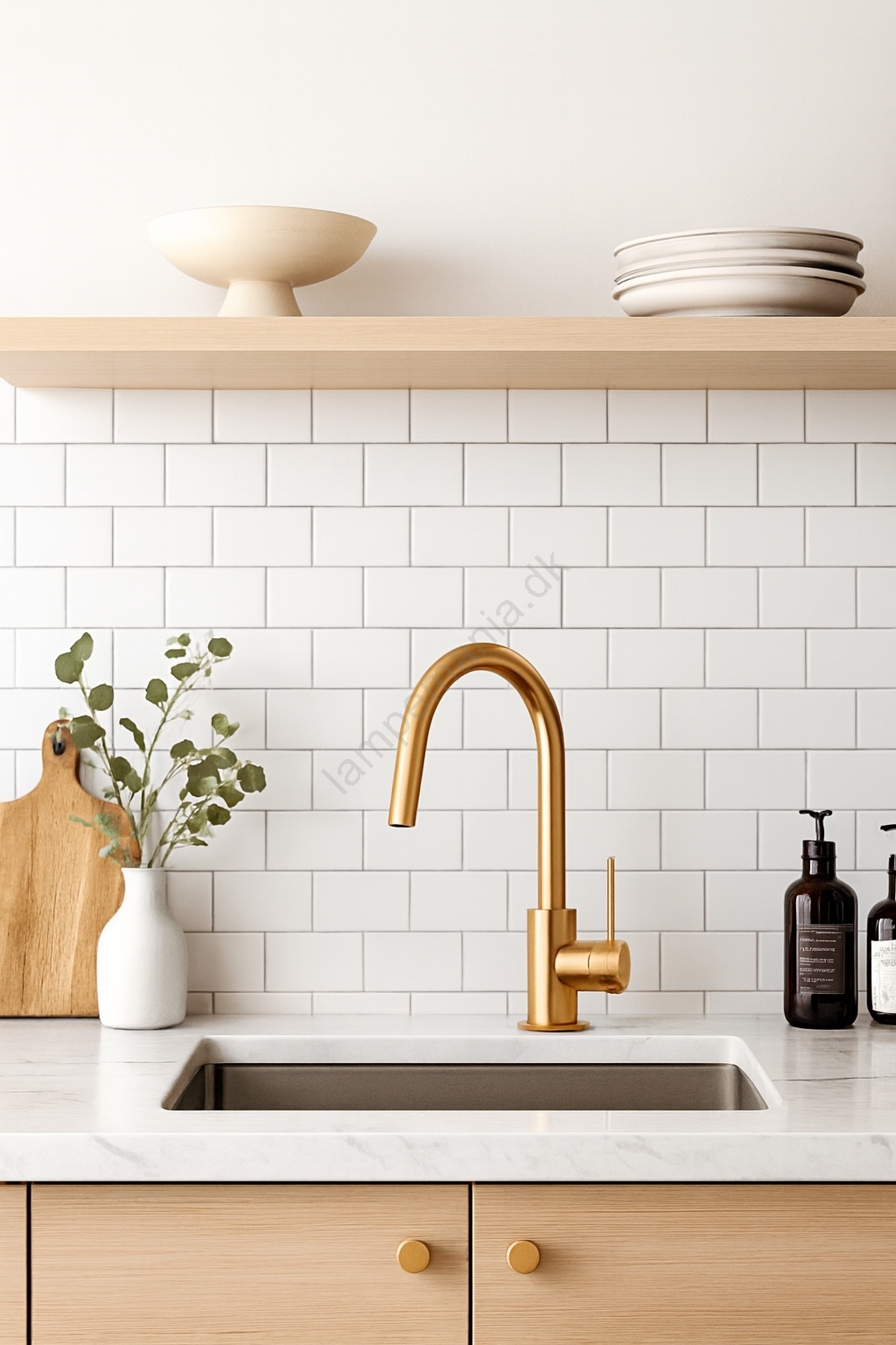 • Elegant bordmonteret håndvaskarmatur i varm guldfinish.