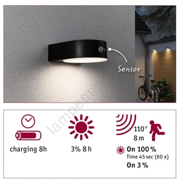 Paulmann 94570 - Soldrevet væglampe med sensor EILEEN LED/5,5W IP44 3,7V 2000 mAh