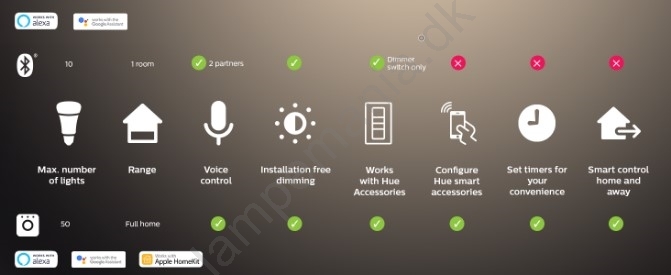 • Du kan tilslutte op til 50 lamper og 10 fjernbetjeninger til Hue-serien.