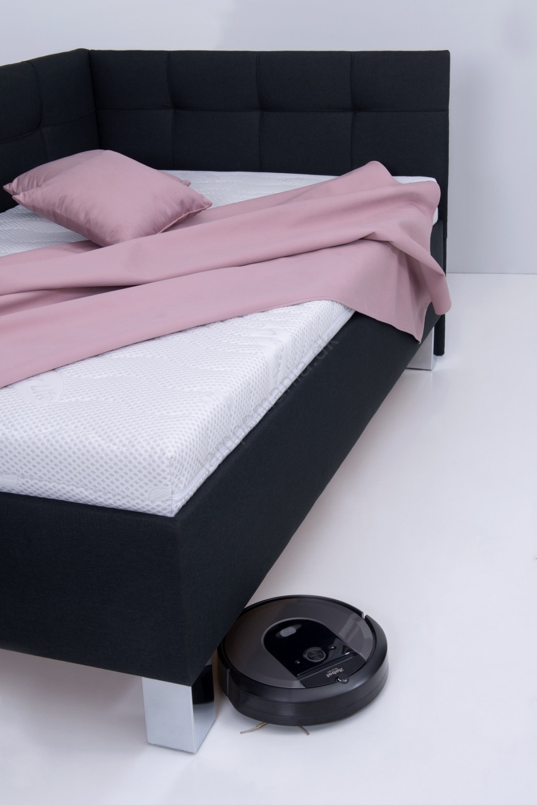 • De stabile og designmæssigt gennemarbejdede ben i krom på 15 cm understreger ikke kun sengens moderne udtryk, men gør det også nemt at gøre rent uden problemer i selv med hjælp fra en robotstøvsuger.