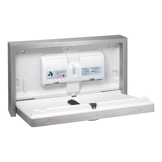 • Vægmonteret puslebord med målene 90 x 52 cm, ideelt til offentlige rum.