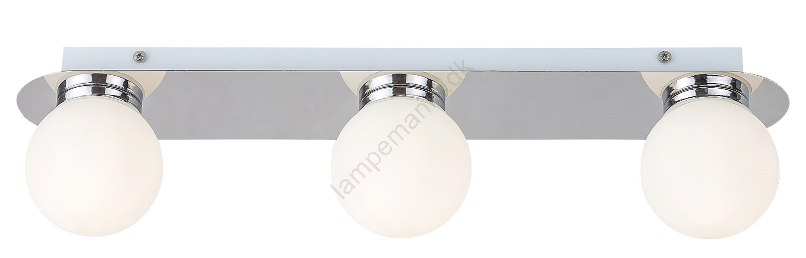 • Vi anbefaler den tredelte Becca loftlampe til badeværelset med et rent design og en kombination af krom og hvid — ideel til dem, der foretrækker runde former.