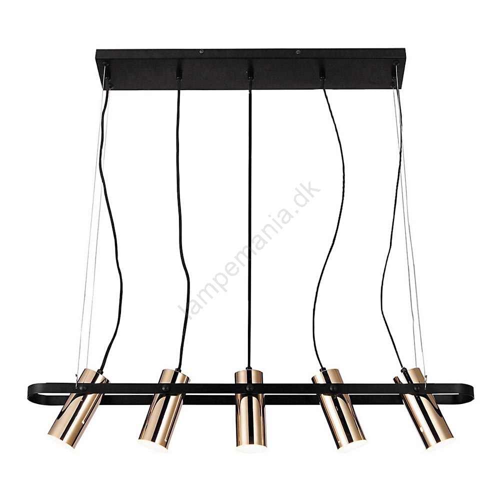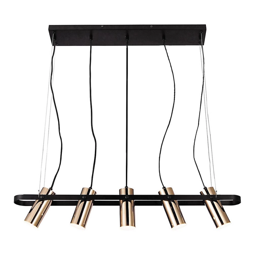 Den hængende lampe Raven med fem lyskilder anbefales til dem, der ikke er bange for at vælge en fremragende og overraskende løsning til indretningen af deres hjem. Designet af den hængende lampe Raven, fremstillet i industriel stil med en mat sort-guld farvekombination, er på ingen måde almindeligt. Lampens metallegeme, udstyret med en rektangulær, mat sort dekorativ base, suppleres af aflange cylindriske skærme, som også er lavet af metal. De fem gyldne lampehoveder er indrammet af et aflangt ovalt element. Den hængende lampe, der udsender varmt hvidt lys, vil være et stilfuldt supplement til din moderne stueindretning. De indbyggede LED-lyskilder i Raven-lampen har en samlet effekt på 25 W, en lysstyrke på 2.000 lumen og en farvetemperatur på 3.000 K. Lampens bredde er 820 mm, og afstanden fra loftet er 1.200 mm. Den hængende lampe Raven leveres med 5 års garanti.