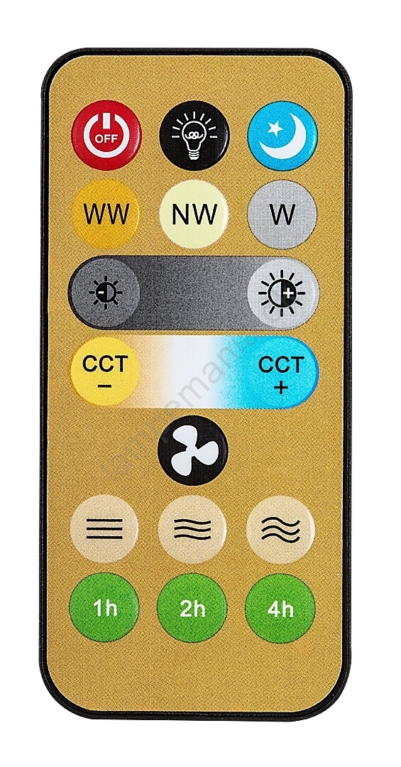 • Med fjernbetjeningen kan du dæmpe lampens lysstyrke, justere farvetemperaturen, indstille en timer, tænde/slukke for ventilatoren eller justere dens hastighed.