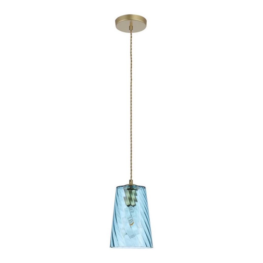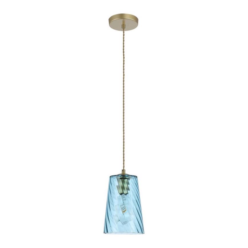 I overensstemmelse med sit navn vil den moderne hængelampe Azurine fylde din stue eller soveværelse med en azurblå, krystalklar glans. Lampen er fremstillet af metal og glas i en særligt elegant guldfarvet og blå farvekombination; lampens skærm er forbundet til en rund guldfarvet dekorativ base med en tekstilledning. Den bølgede overflade på den aflange glaslampskærm i klokkeform fremkalder havets bølger. Azurine-lampen kan anvendes med en enkelt pære på op til 40W, fatningen er E27. Hvis du ønsker at forbedre den intime hjemmestemning, anbefales det at vælge en varm hvid lyskilde til denne lampe. Målene på hængelampen Azurine er som følger: skærmens diameter er 150 mm, afstanden fra loftet er 1750 mm, monteringsdiameteren er 120 mm. Denne model leveres uden lyskilde.