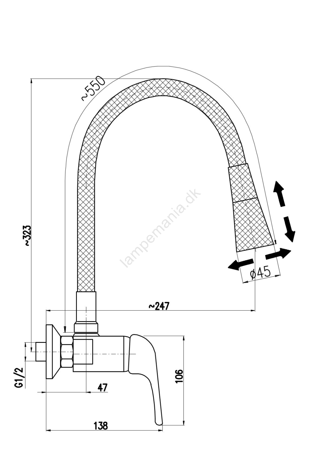 • Vægmonteret køkkenarmatur med fleksibel, drejelig tud og indbygget bruser.