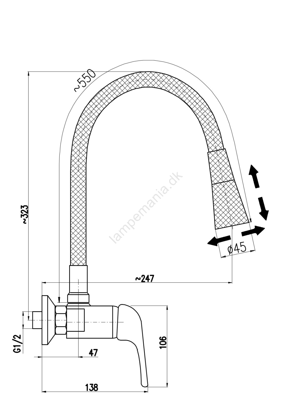 • Vægmonteret vask- og køkkenarmatur med fleksibelt, svingbart udløb og bruser.