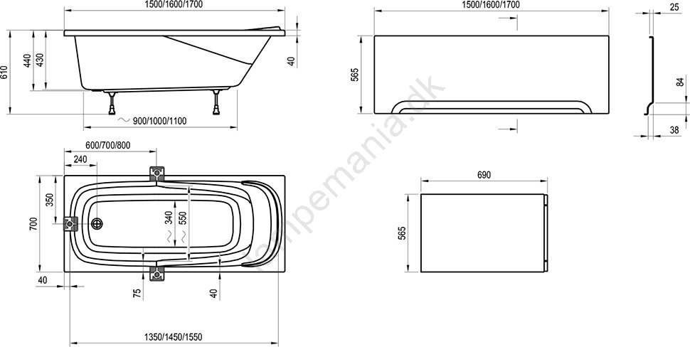 • Målene 150 x 70 cm og et volumen på 165 l sikrer god plads til komfortabelt bad.