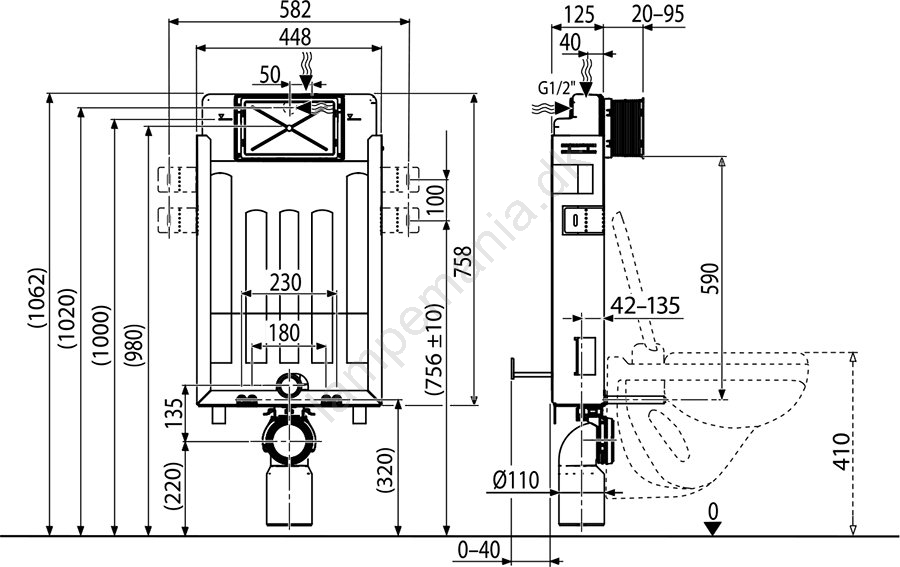 • Basismodul til væghængt toilet med tilslutningsafstand 180 eller 230 mm er beregnet til indbygning og beklædning.