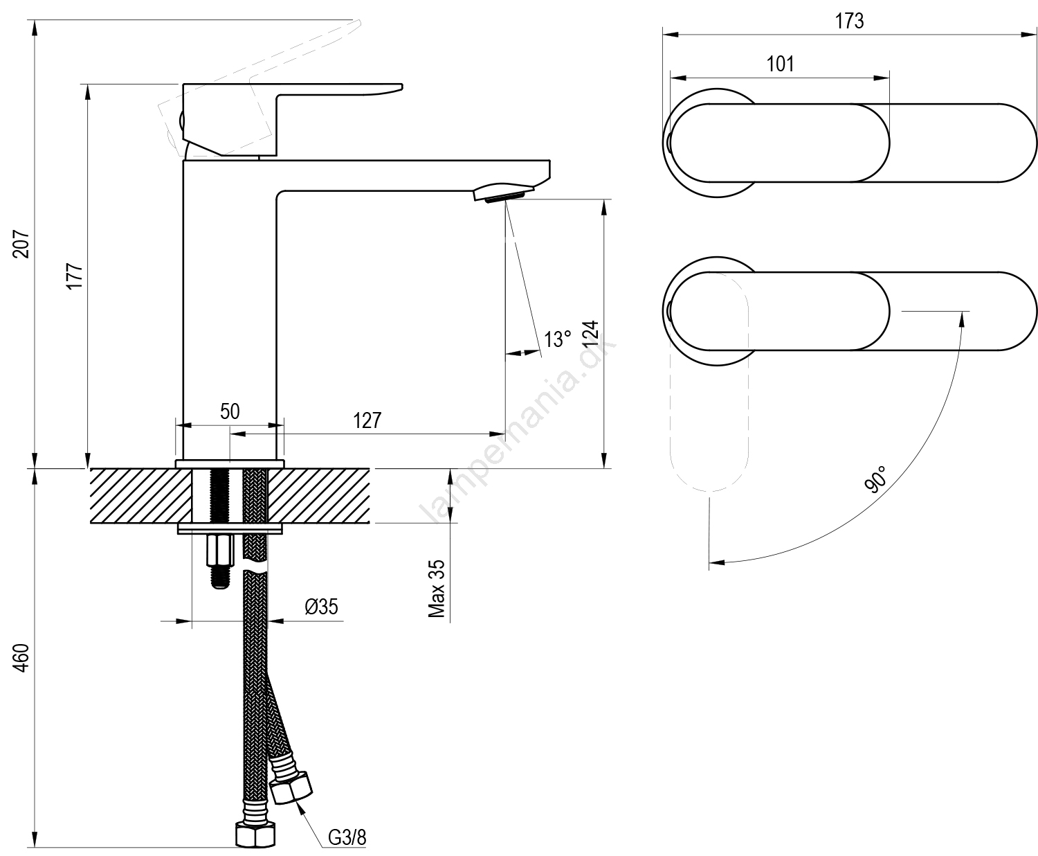 • Tilslutningen lettes af fleksible slanger med en længde på 450 mm og G3/8-tilslutning.