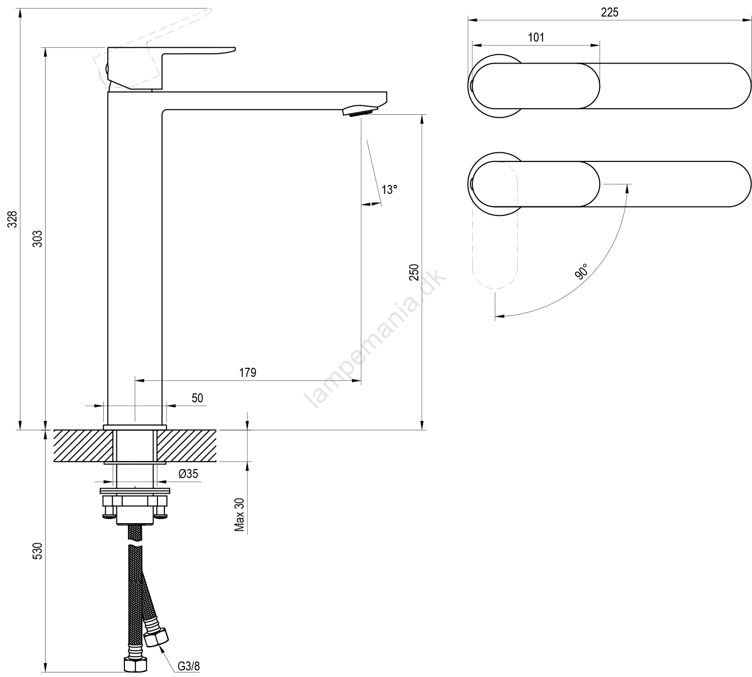 • Blandingsarmaturet er udstyret med fleksible tilslutningsslanger på 450 mm med G3/8 og leveres uden bundventil.