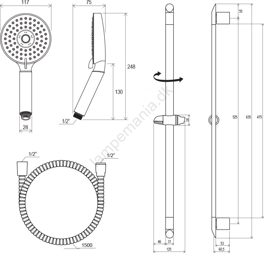 • Drejelig brusestang med justerbar bruseholder, længde 63,5 cm.