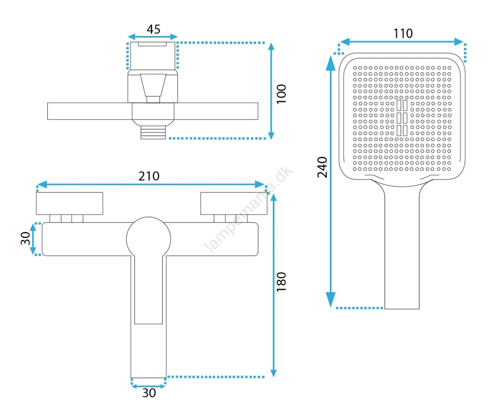 • Sættet indeholder: badekarsarmatur, håndbruser, bruseslange, vægbeslag til håndbruser.