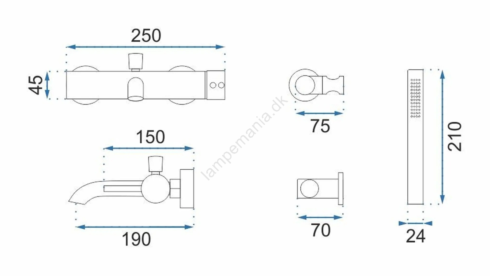 • Sættet indeholder: badekarsarmatur, håndbruser, bruseslange (190 mm), holder til håndbruser.