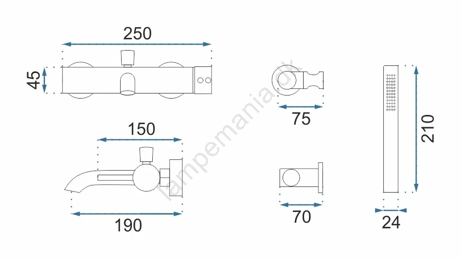 • Sættet indeholder: badekarsarmatur, håndbruser, bruseslange (190 mm), holder til håndbruser.