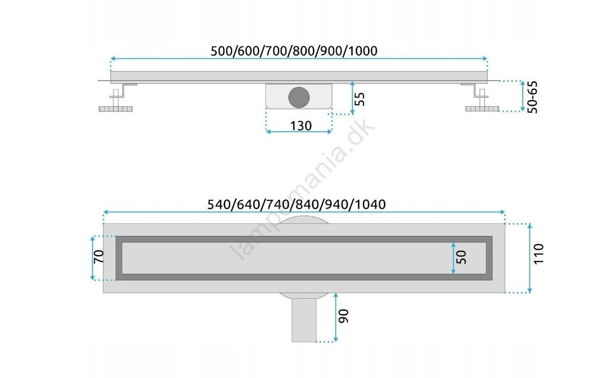• De højdeindstillelige ben (50–65 mm) gør det nemt at tilpasse afløbet til forskellige gulvhøjder.