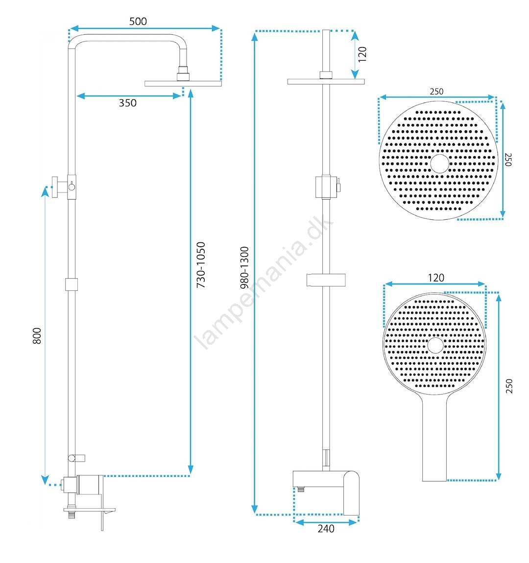 • Indstilling af brusestang: 98 - 130 cm.