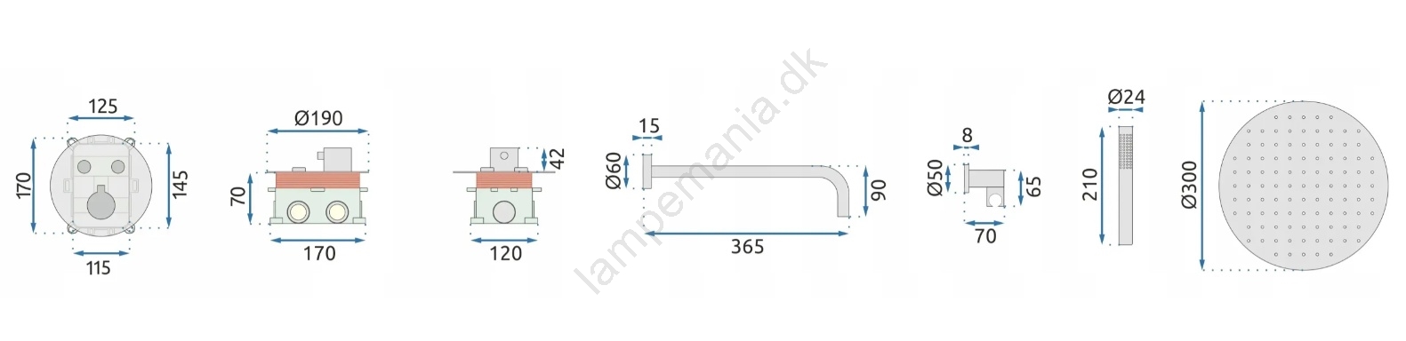 • Pakkeindhold: indbygningsboks, komplet armatur, brusearm, hånd- og hovedbruser, holder til håndbruser, 150 cm slange.