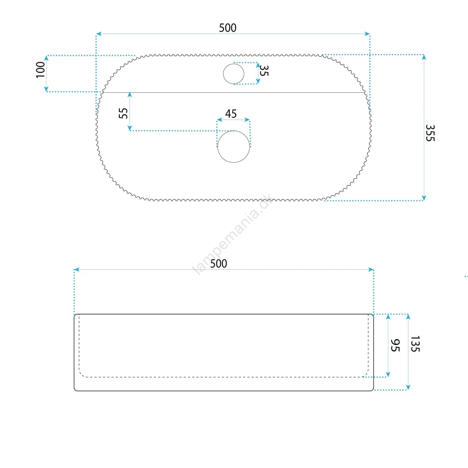 • Håndvaskarmatur og bundventil medfølger ikke.