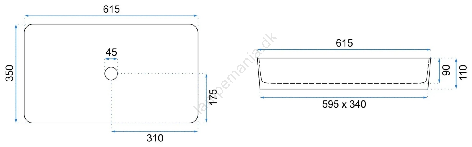 • Håndvaskarmatur og bundventil medfølger ikke.
