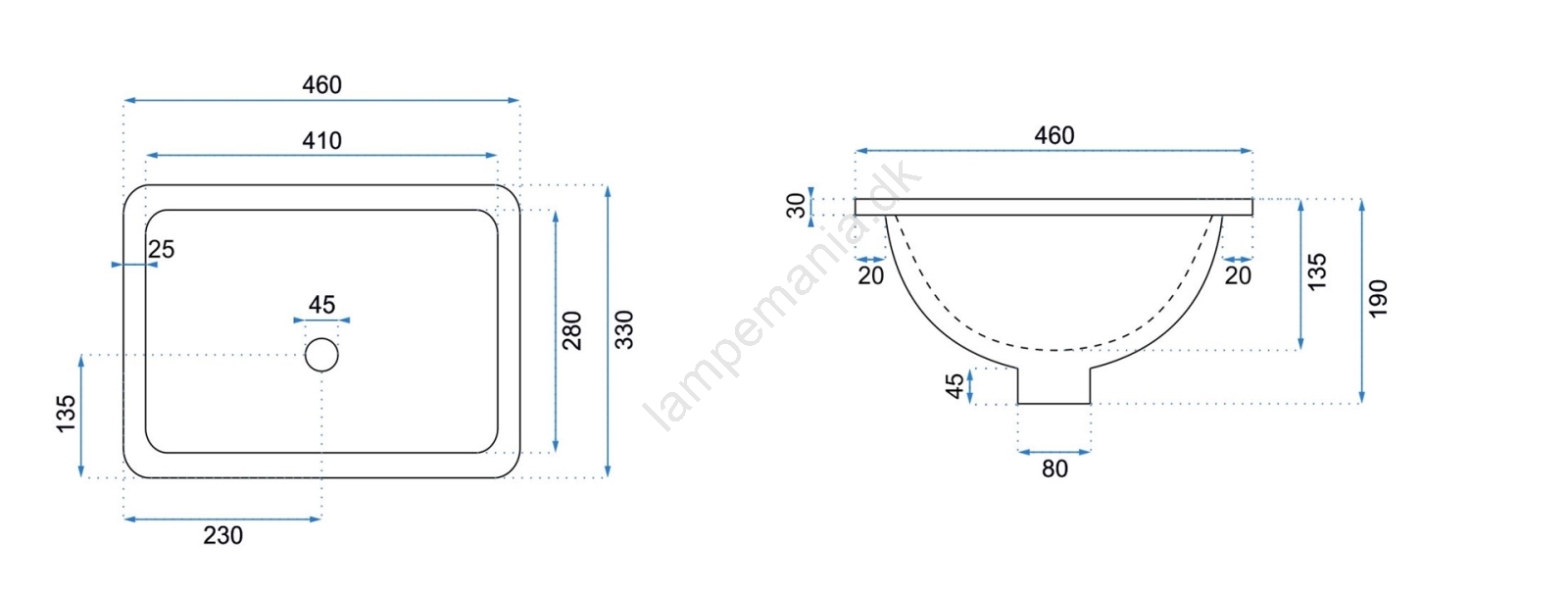 REA-U6653 - Nedfældet håndvask ADELA 33x46 cm keramisk/højglans hvid