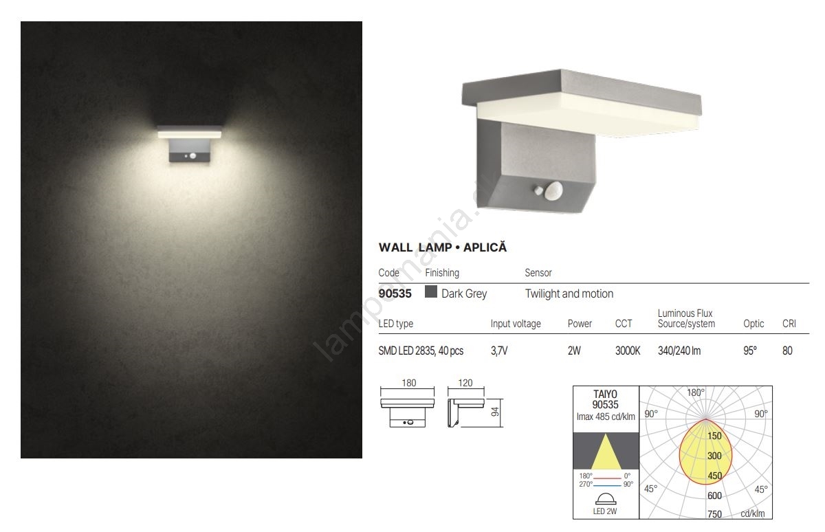 Redo 90535 - Soldrevet LED væglampe med sensor TAIYO LED/2W/3,7V 3000K 2200 mAh IP54 antracit