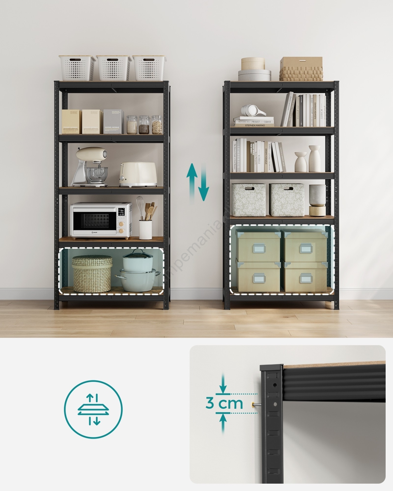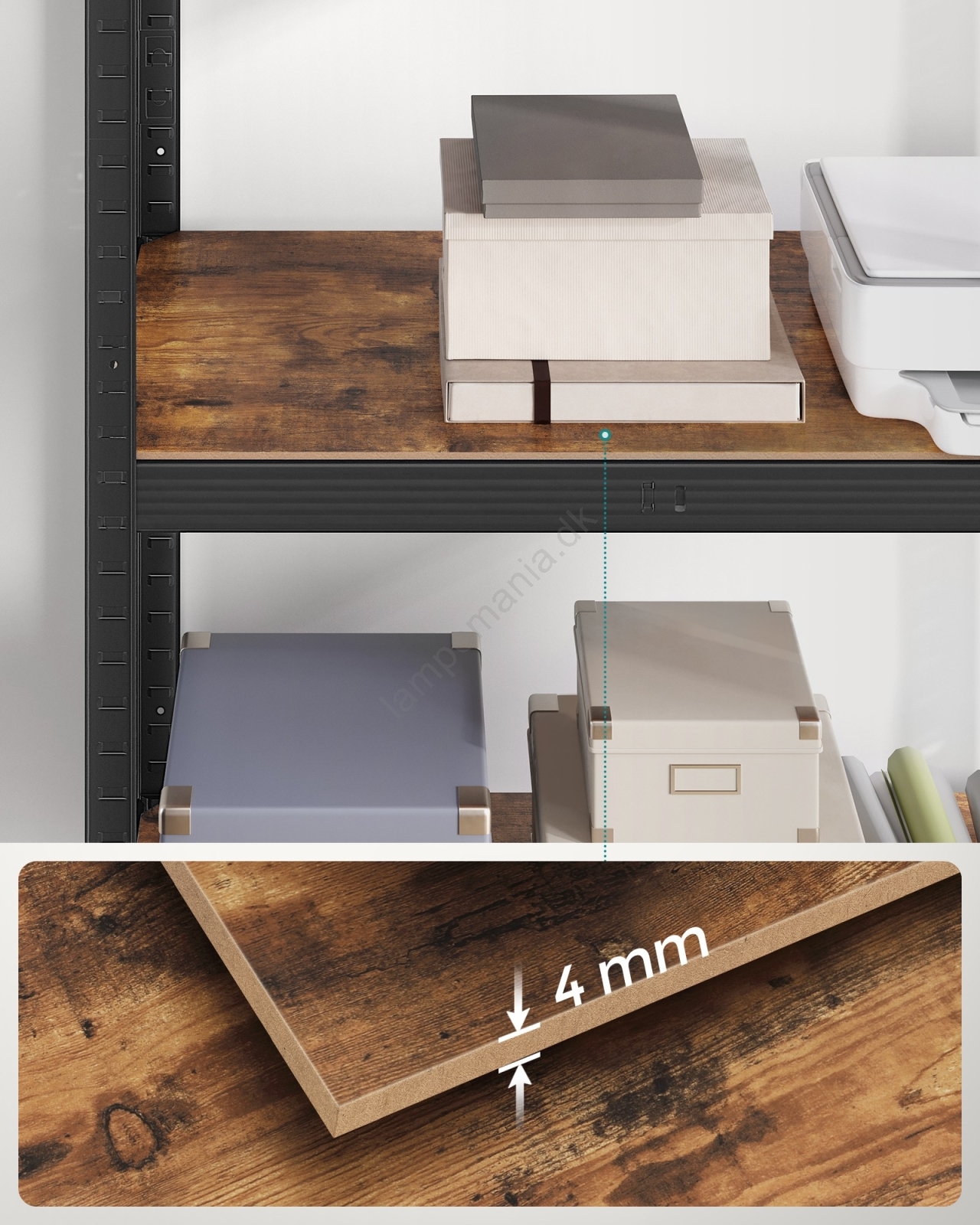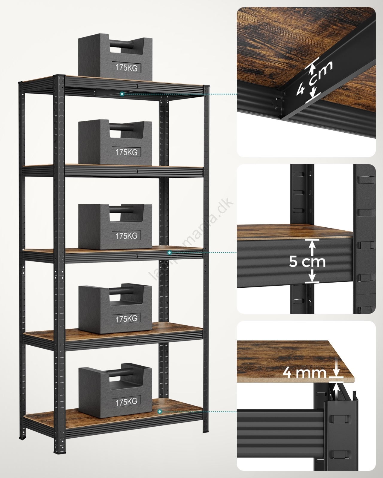 • Hver hylde kan bære op til 175 kg og kan sikkert rumme maling, værktøj og træningsudstyr.