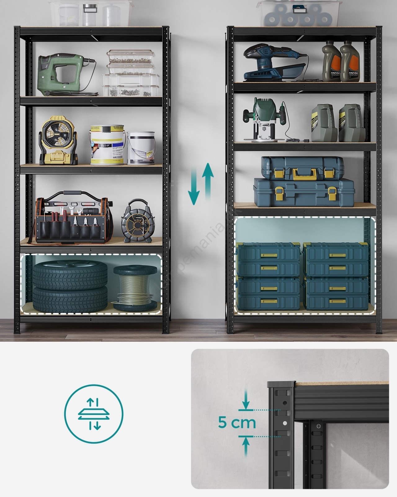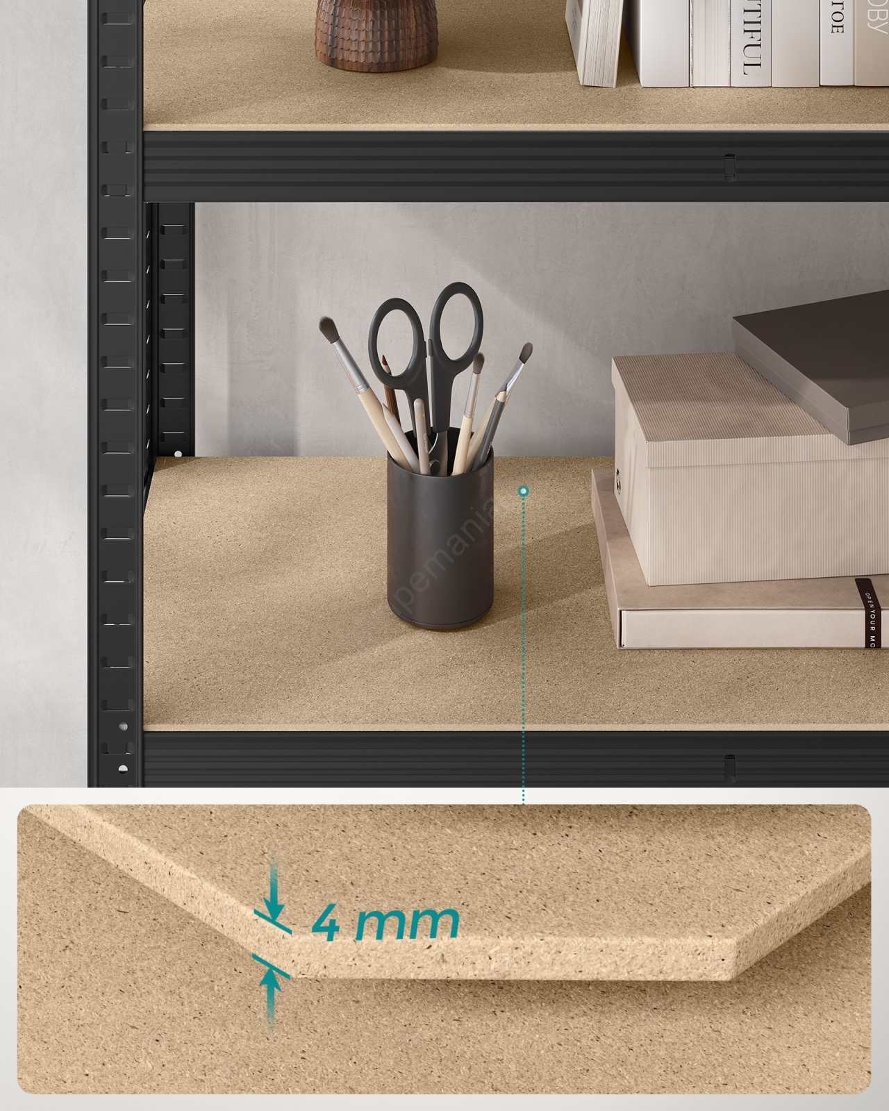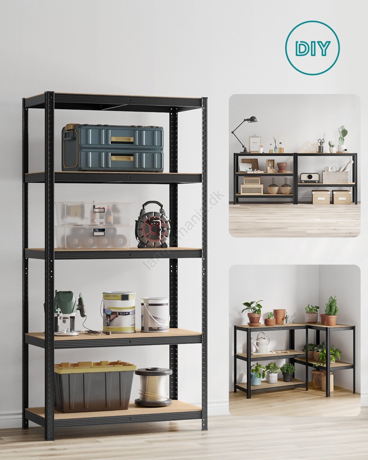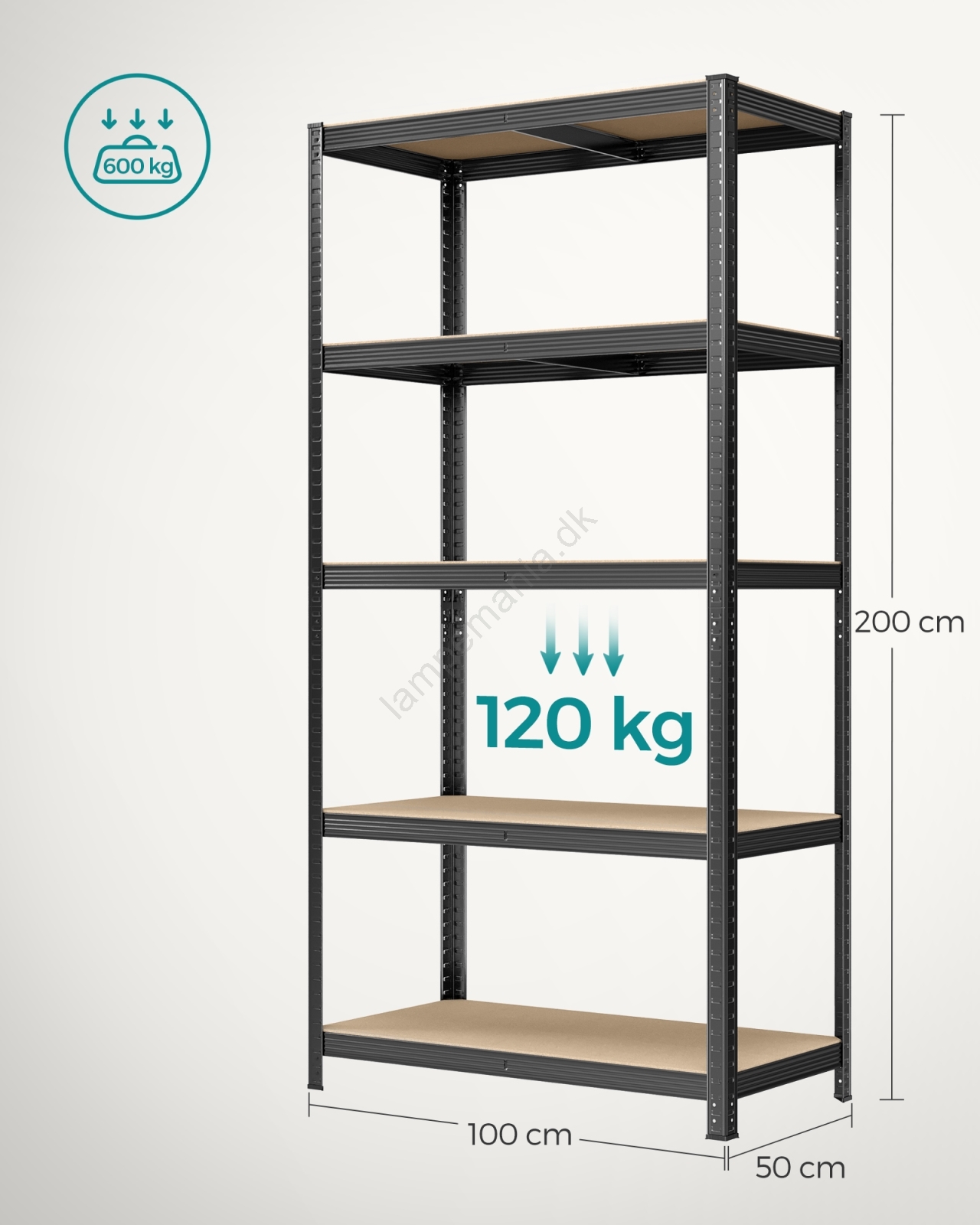 • Hver hylde kan bære op til 120 kg og kan sikkert bære maling, værktøj og træningsudstyr.
