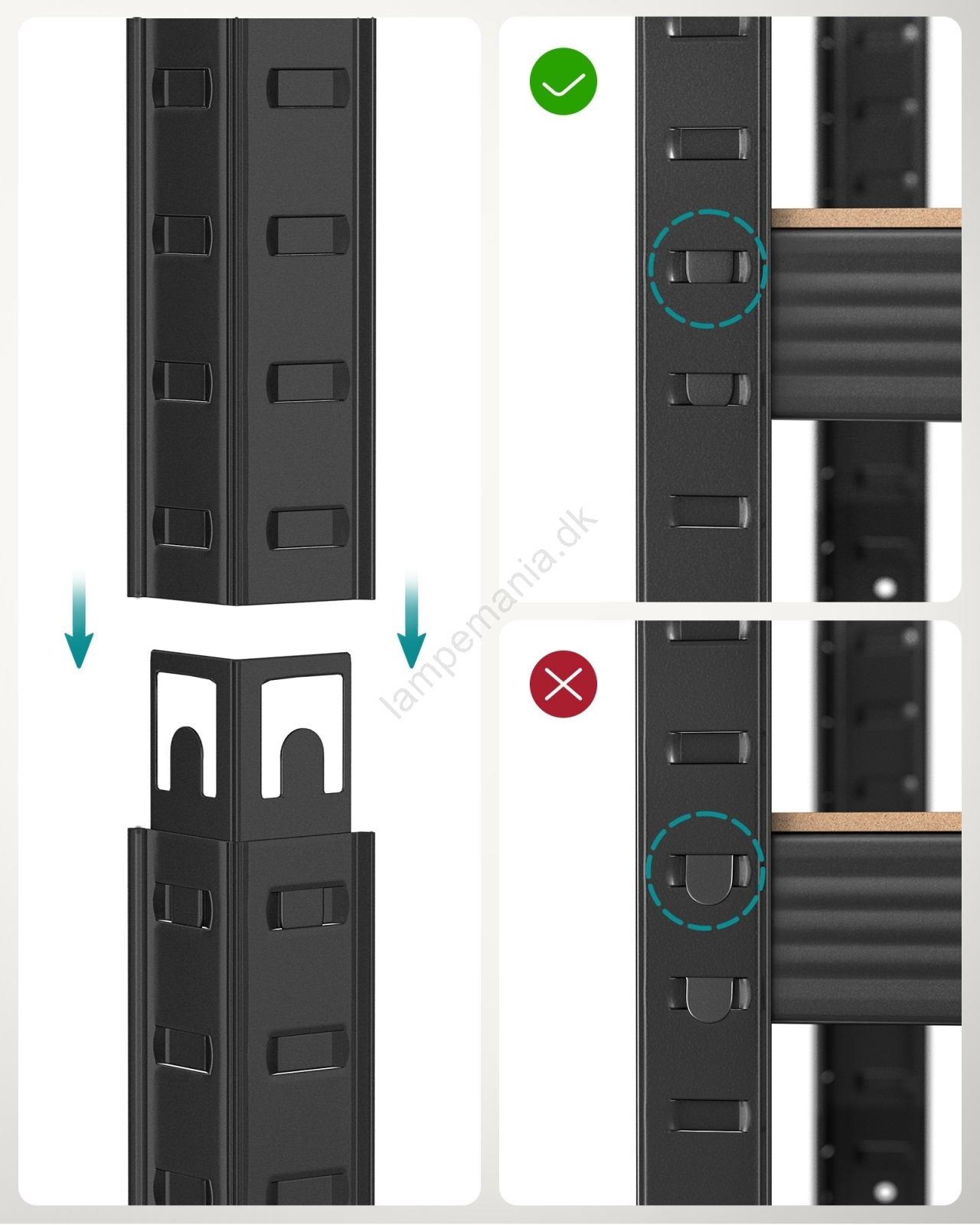 • Pakken indeholder et fastgørelsessæt mod væltning, som hjælper dig med at fastgøre reolen til væggen, så den bliver mere stabil og sikker.