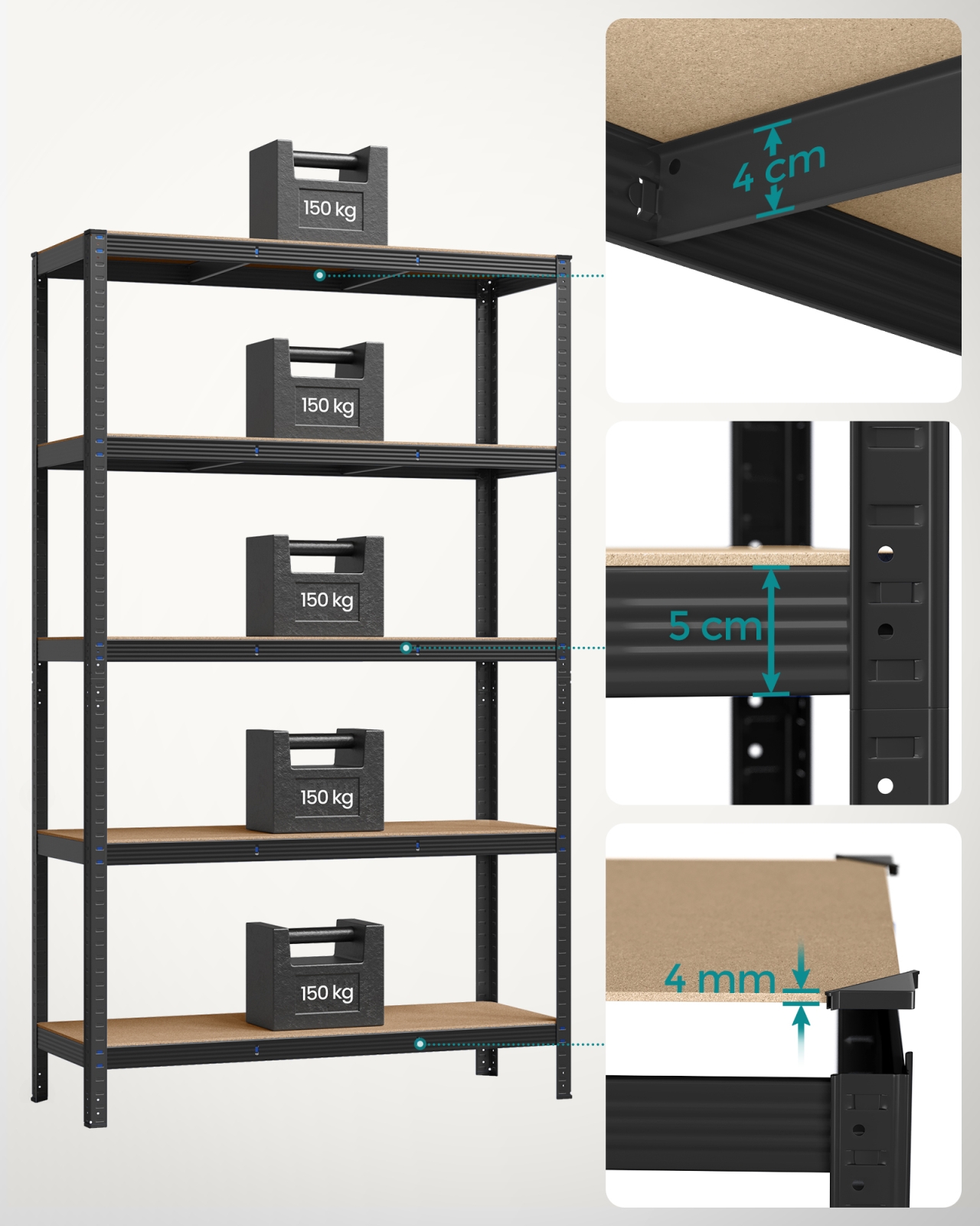 • Hver hylde kan bære op til 150 kg og kan sikkert rumme maling, værktøj og træningsudstyr.