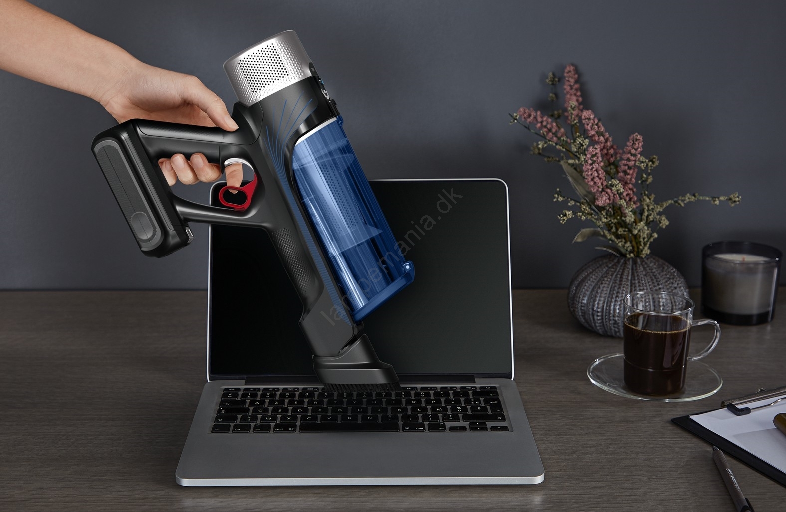 • Meget kraftfuld trådløs stavstøvsuger designet til omfattende rengøring: tørre og våde overflader takket være teknologien „Aqua“ – støvsugning og mopping samtidig.