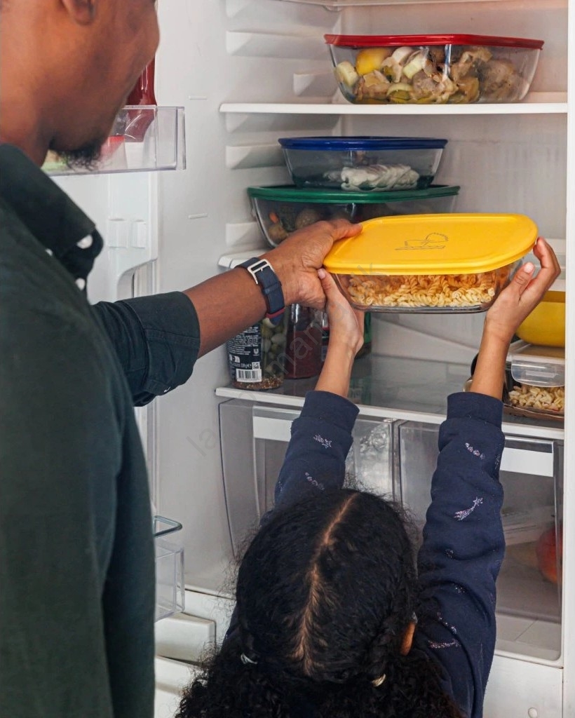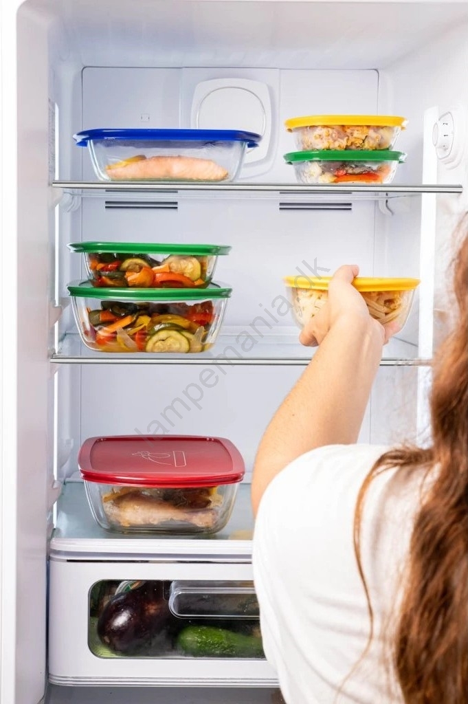 • Låget muliggør sikker opbevaring i køleskab og fryser.