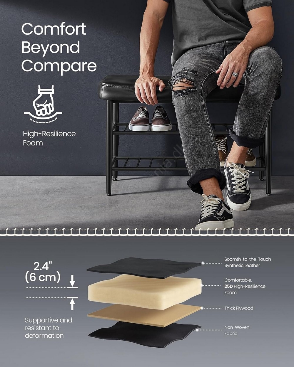 • Blødt sæde i 8 cm høj 25D-skum, giver dig mulighed for at sidde komfortabelt og tage sko på eller af.