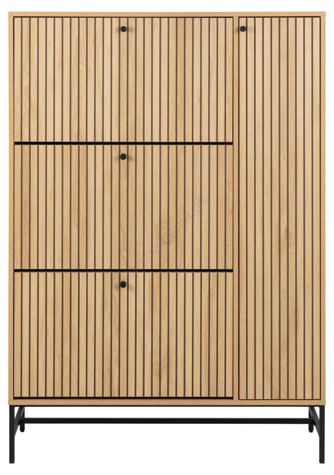 • Dette skoskab i egetræ-look med lamelfront giver din entré stil og praktisk funktionalitet.