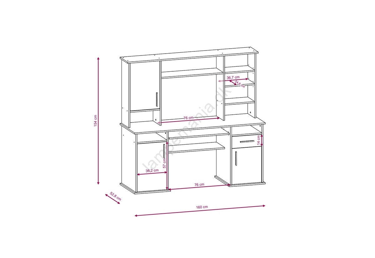 • Den tilbyder en rummelig bordplade, en udtrækkelig tastaturbakke og flere opbevaringsmuligheder, herunder lukkede skabe, åbne hylder og lodrette rum.