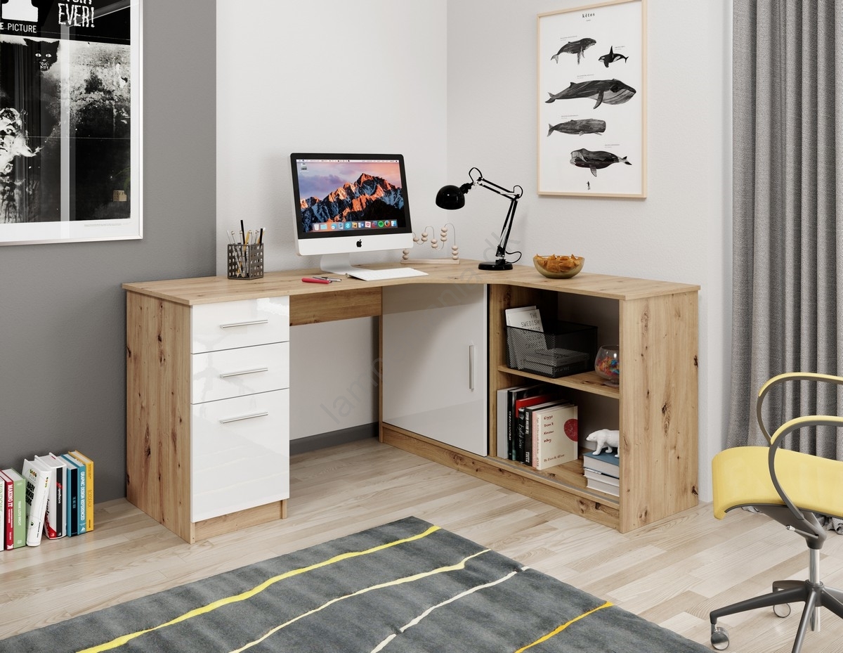 • Skrivebord med hylde og skuffer ROBERTO venstrevendt artisan-eg/hvid